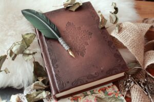 A high angle shot of a quill pen on an old book covered with dried flower petals[/caption]